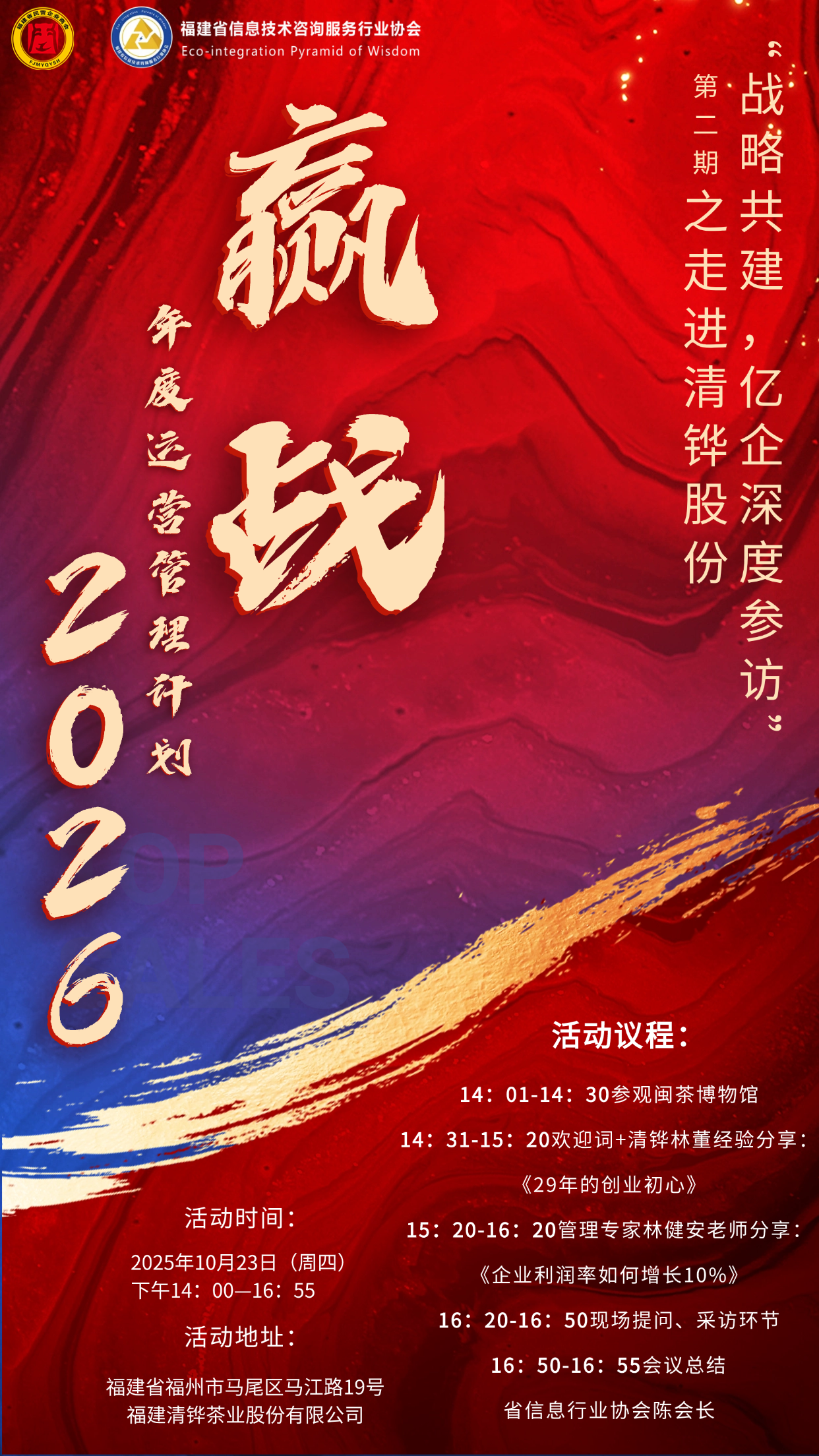 由福建省信息技术咨询服务行业协会、福建省民营企业商会联合发起「赢战2026」年度运营管理计划·深度参访——走进清铧股份,探秘茶文化经营智慧,开始报名了!