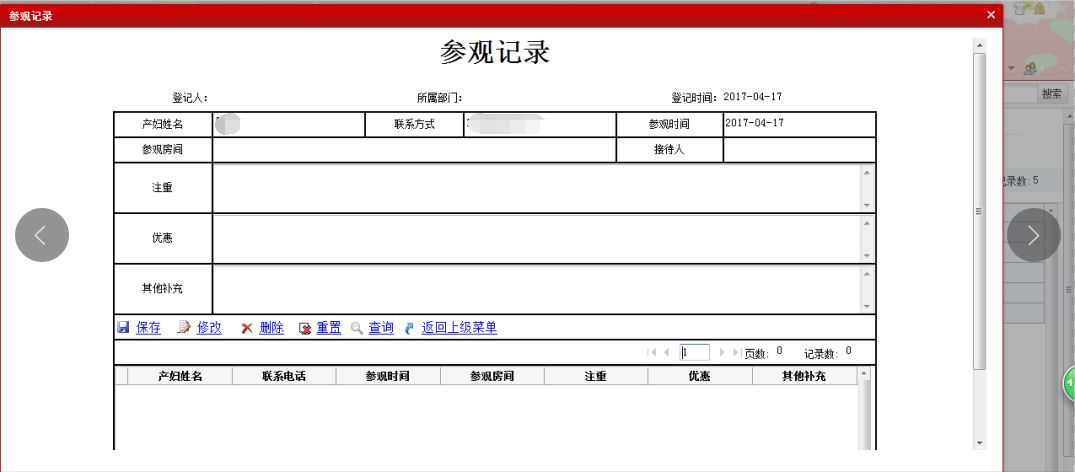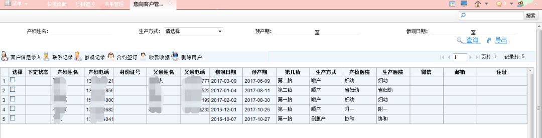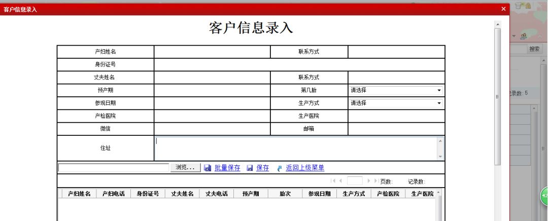 1、客户信息录入:对到店客户的身份信息进行录入,包含客户姓名、电话、预产期等信息。