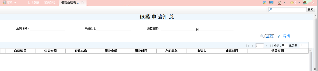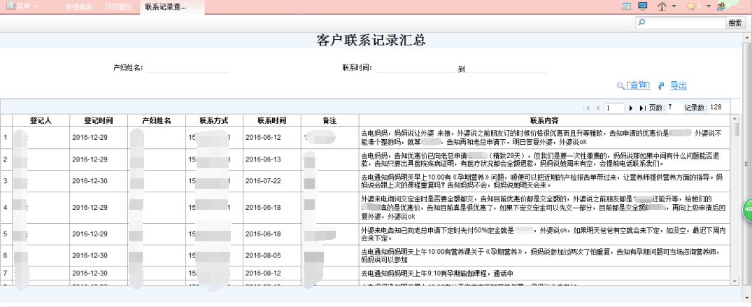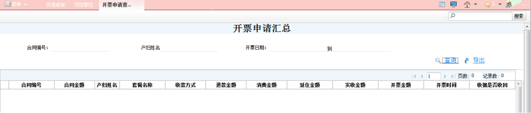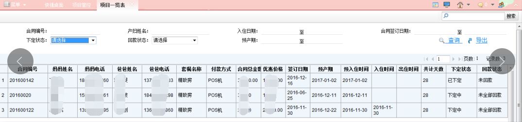 主要实现一些报表的生成。包含产妇情况表,客户关系汇总表,合同一览表,房态管理单,服务项管理汇总表,用品出入库明细表等。