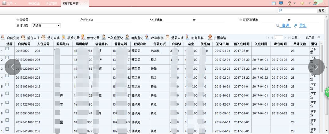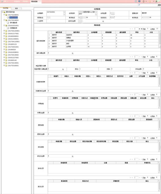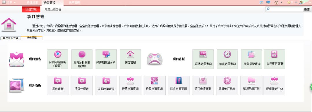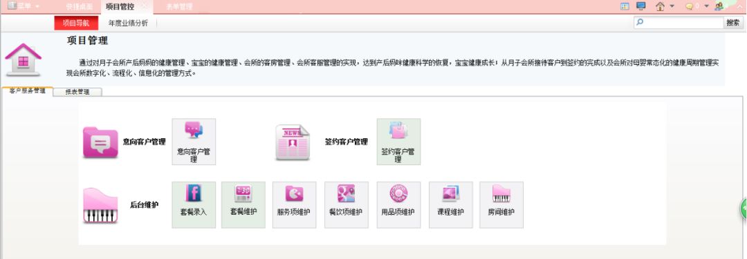 母婴护理中心项目管理系统主要分客户管理、合同管理、房态管理、服务项管理、财务管理、用品管理、报表管理七个模块。