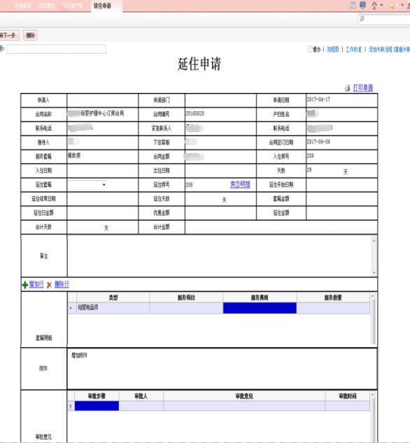 5、延住申请:产妇由于某些原因需要续住,包含续住人姓名、联系方式等信息。