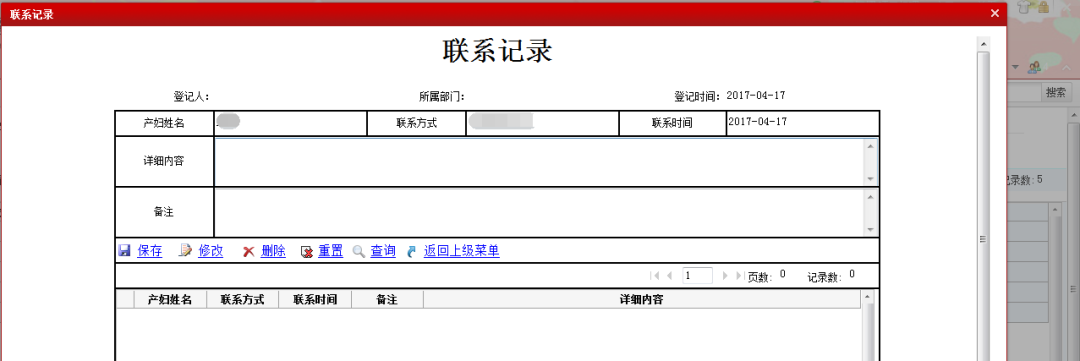 1、合同录入:客户签约,填写相关合同信息(包含申请人、接待人、合同名称、产妇姓名电话等信息。