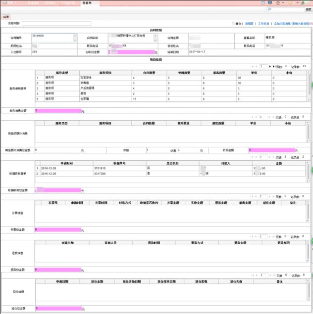 6、财务结算:产妇离店时对各项费用的核算,包含产妇的各类消费等信息。