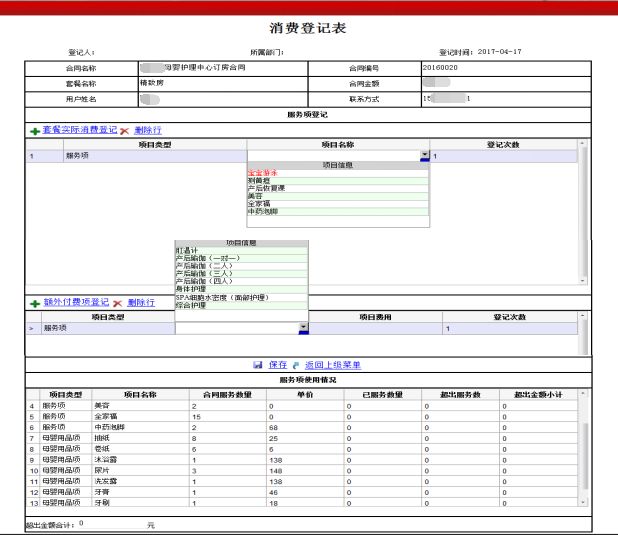 1、服务项消费登记:对产妇的各项服务消费项等信息的一个录入登记。
